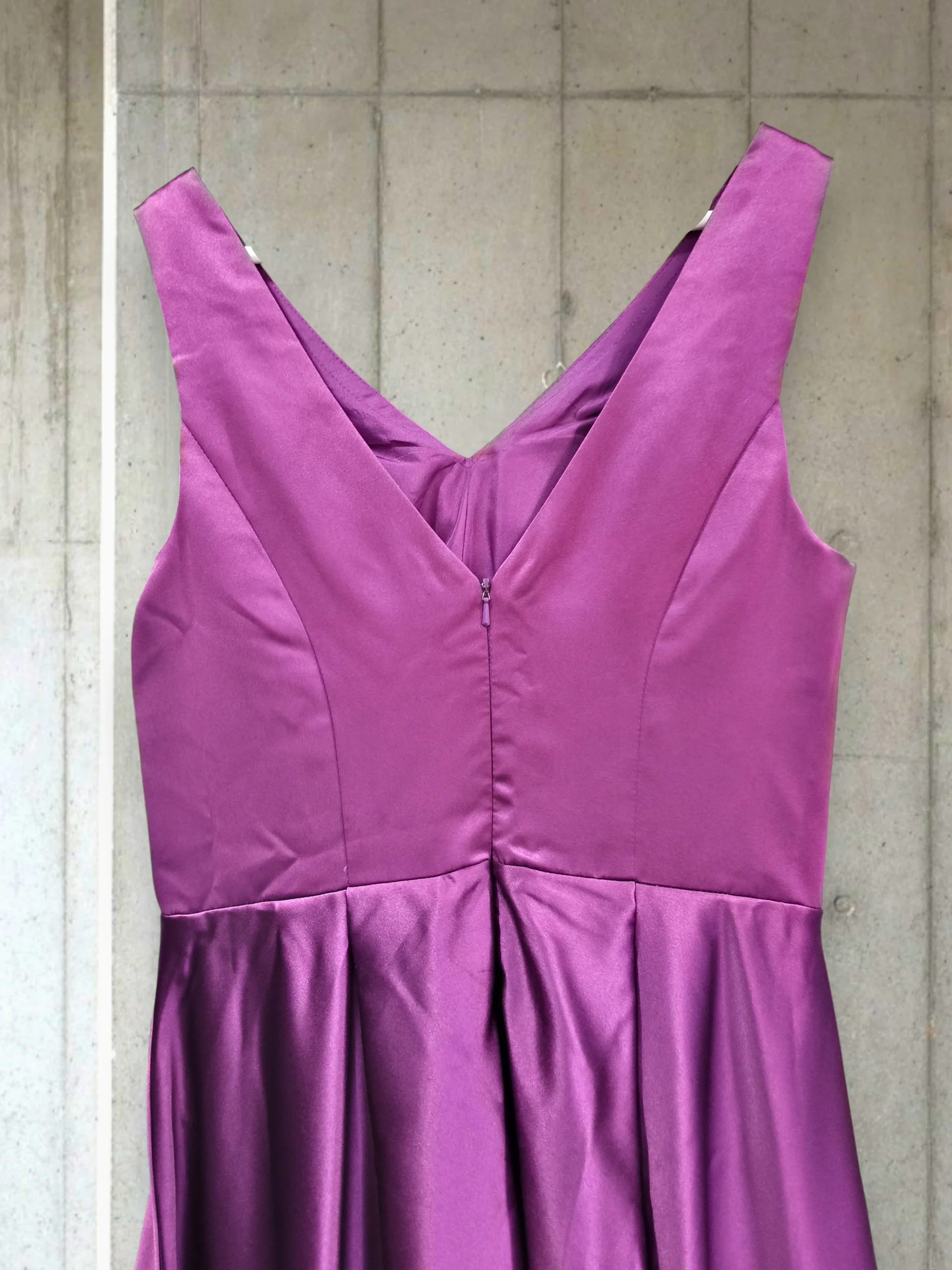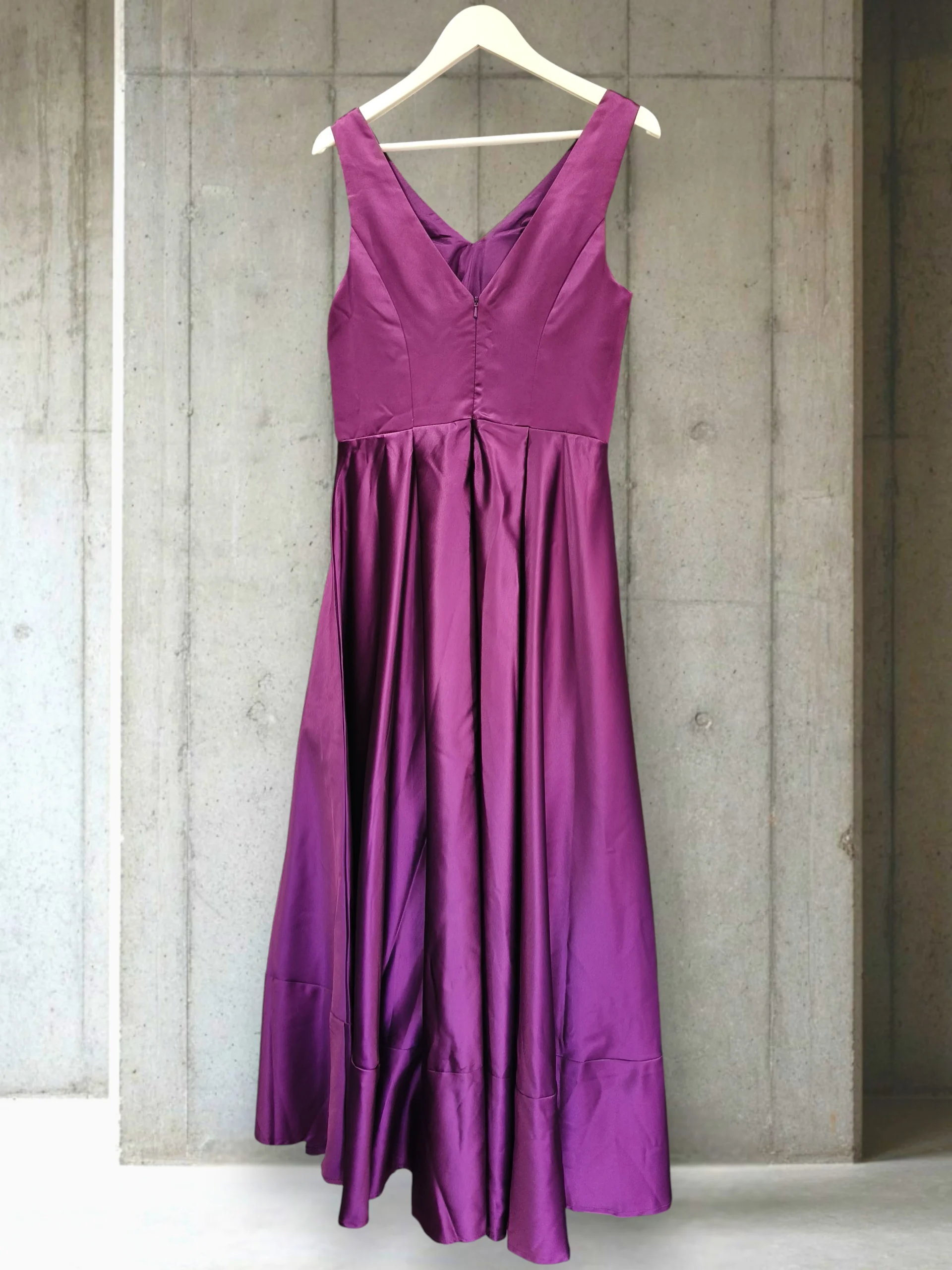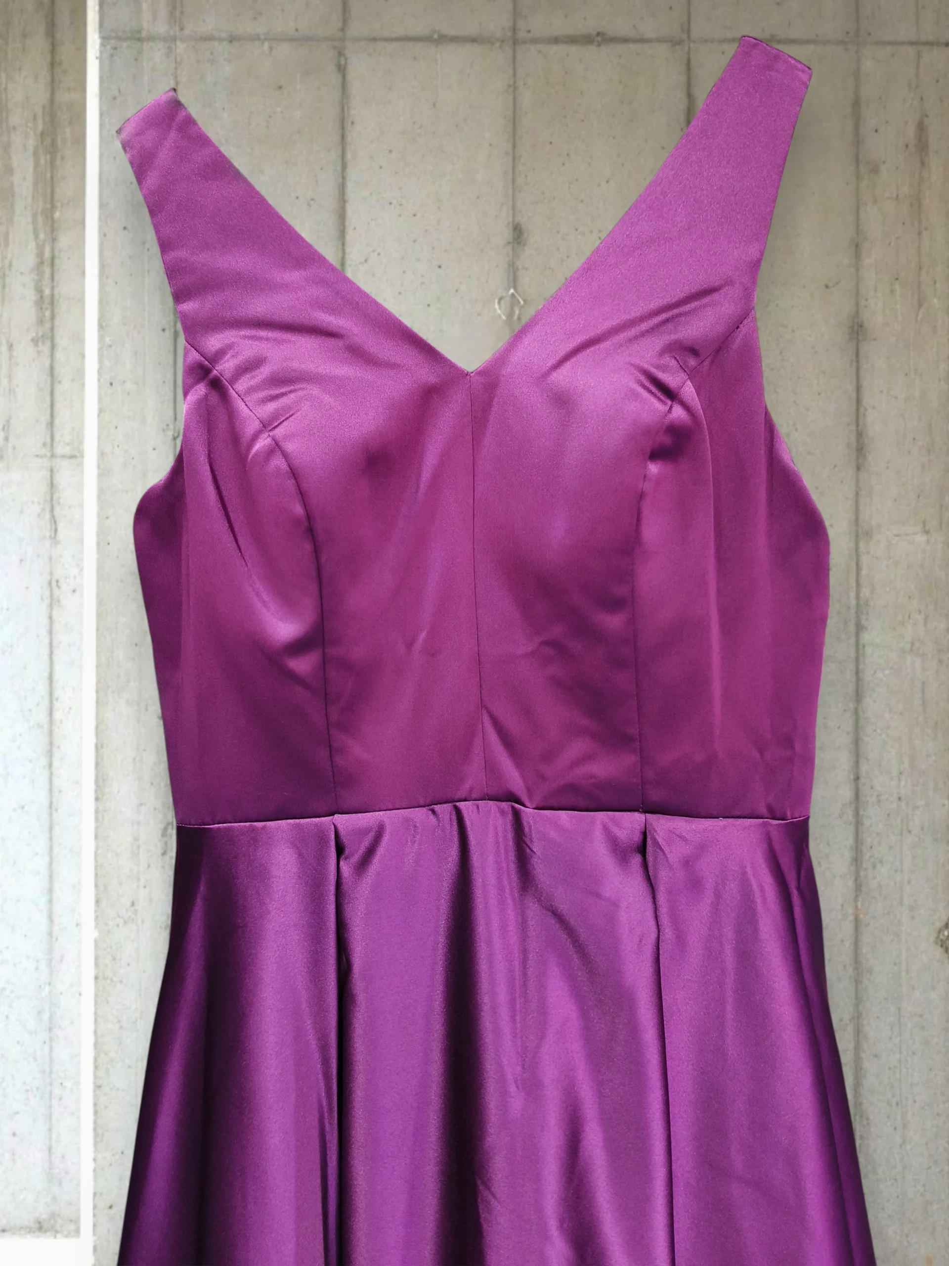 This stunning grape-colored dress is a perfect choice for semi-formal or cocktail events. It features a fitted, sleeveless bodice with a flattering V-neckline. The fabric has a beautiful, subtle sheen and luxurious feel. The full skirt is accented by gentle box pleats at the fitted waistline, providing volume and movement. A zipper closure down the back ensures a smooth and tailored fit.