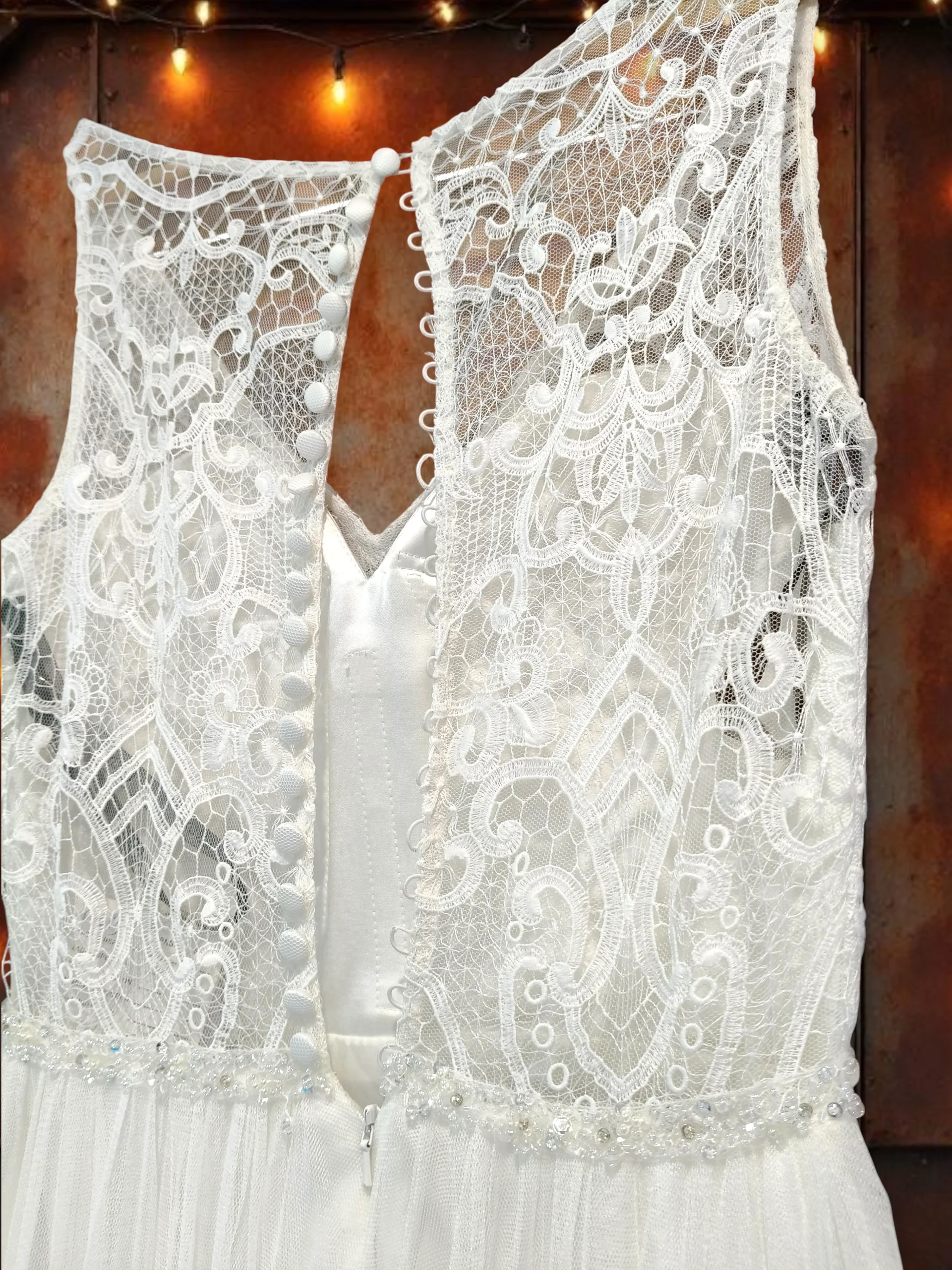 This romantic and free-spirited A-line gown is perfect for the bride seeking a blend of delicate detail and effortless flow. The bodice is covered with a lace layer and the back closes with a zip up to the waist and continues with nostalgic buttons all the way up. From the waist down, the airy skirt creates a gorgeous, light texture and movement that is ideal for beach or boho weddings.
