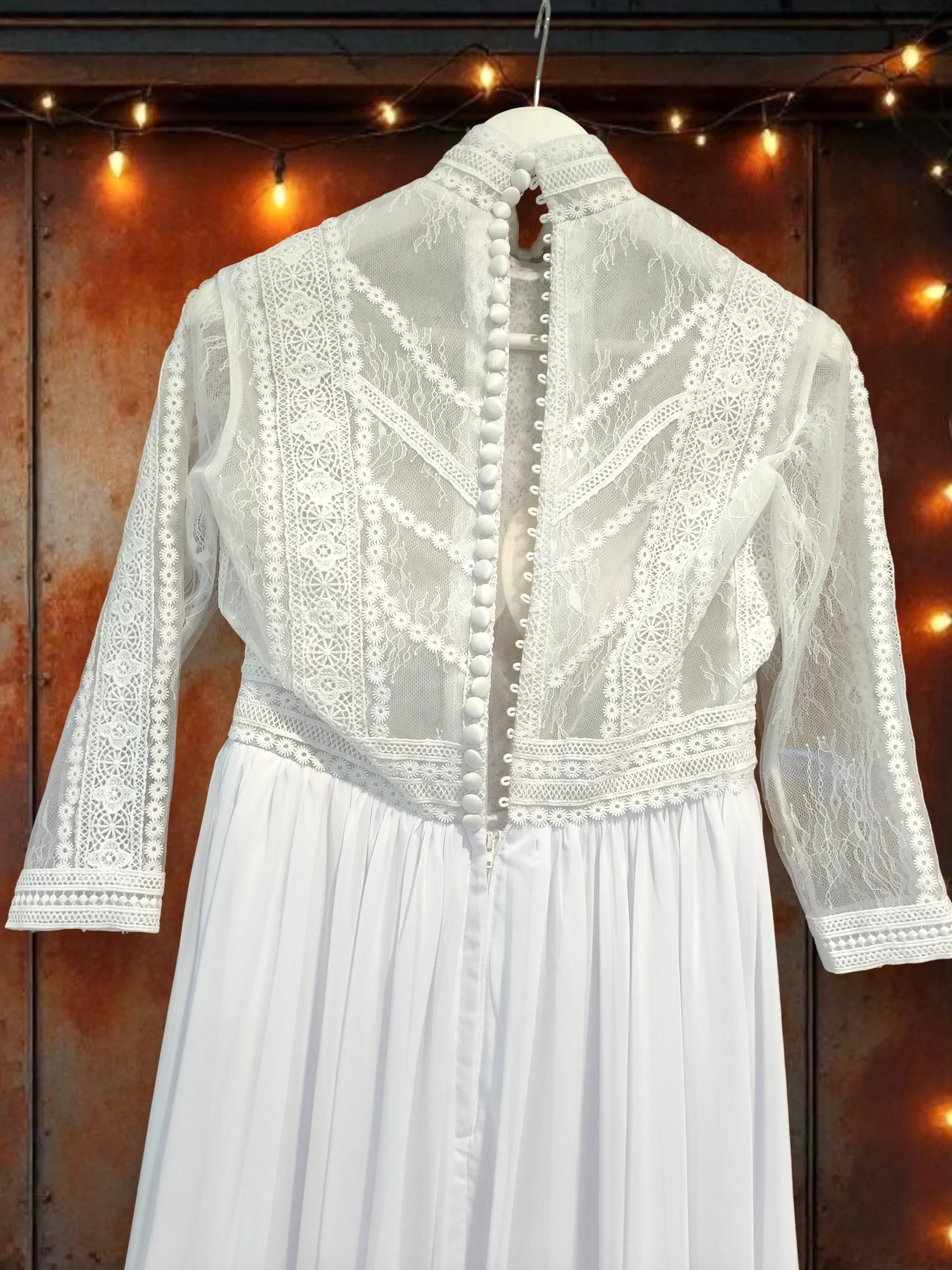 This unique bridal gown masterfully blends vintage elegance with bohemian simplicity, featuring a beautiful A-line silhouette. The bodice is highly detailed with a distinctive geometric lace pattern, showcasing a modest high collar and elegant sleeves. A delicate beaded trim cinches the empire waist, from which the flowing skirt of soft, airy chiffon gracefully drapes to the floor. The back is finished with a refined row of buttons extending all the way up the neck, making it an ideal choice for a boho or romantic wedding.