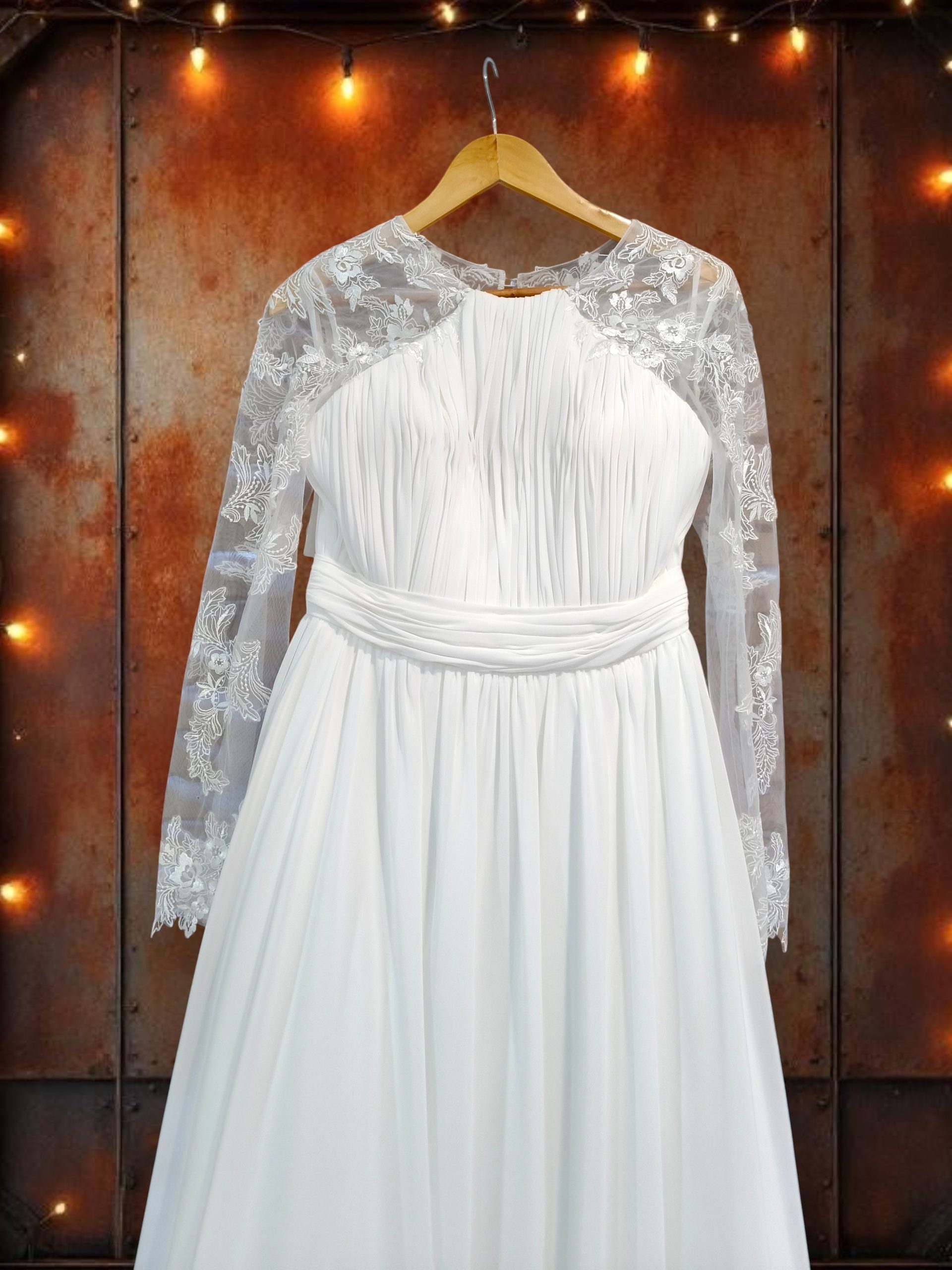 A long sleeved wedding dress with lace that beautifully traces the arms and continues up over the shoulders. A gently ruched bodice and a subtle chiffon waistband cinch the figure, providing a flattering natural waistline. The back is elegantly secured with a combination of a subtle zip-up closure and buttons that run up the sheer lace to the neckline.