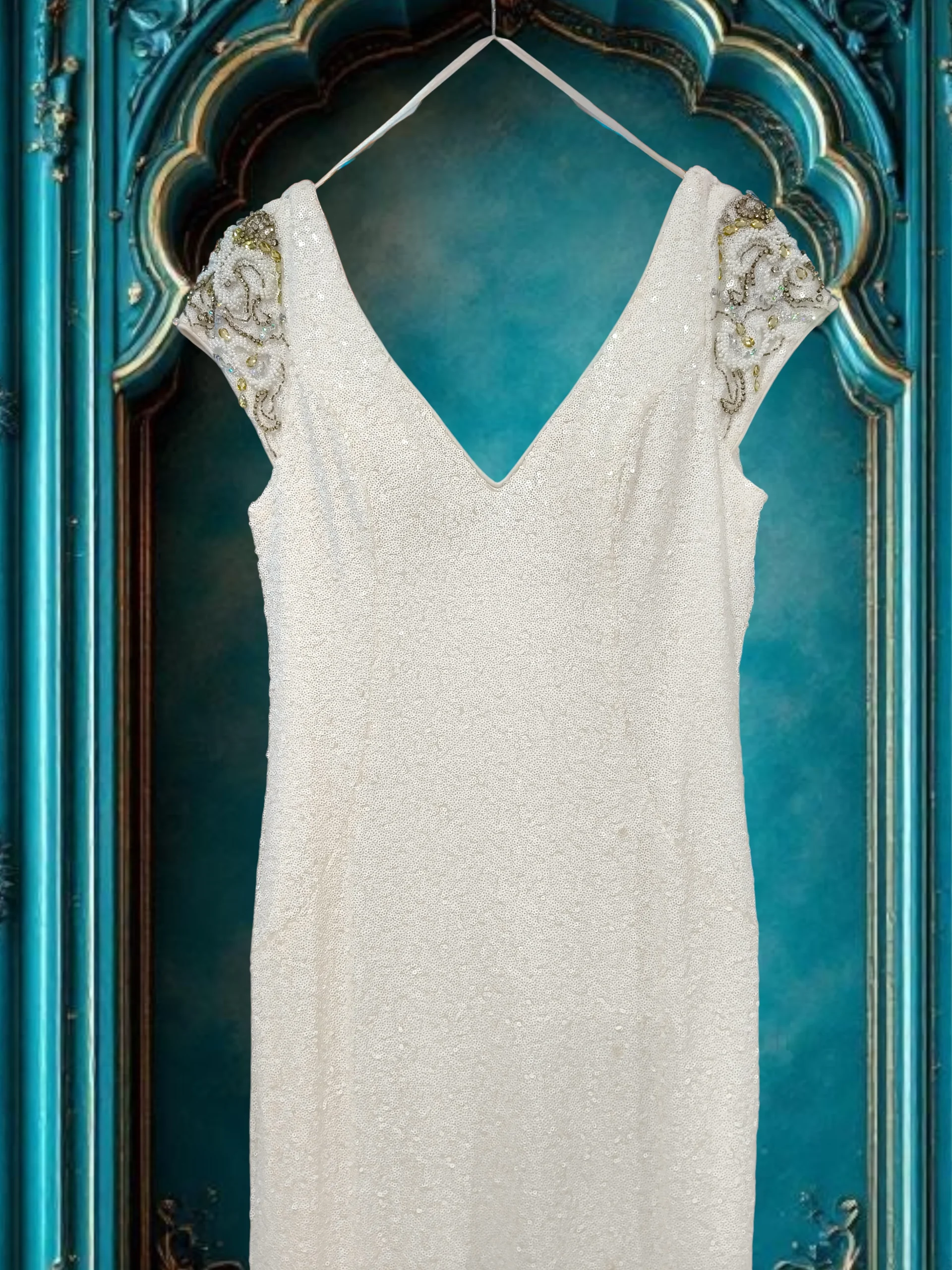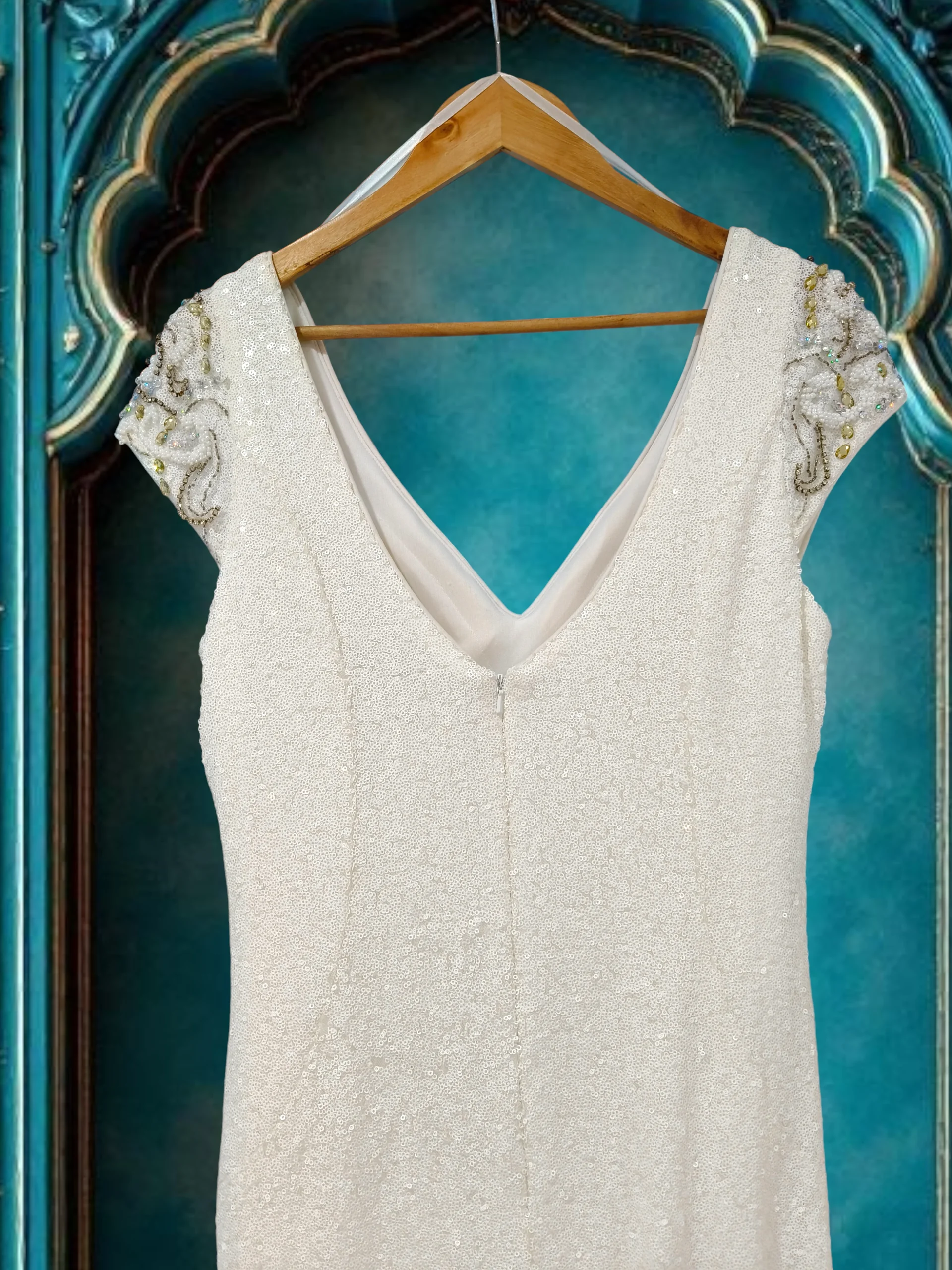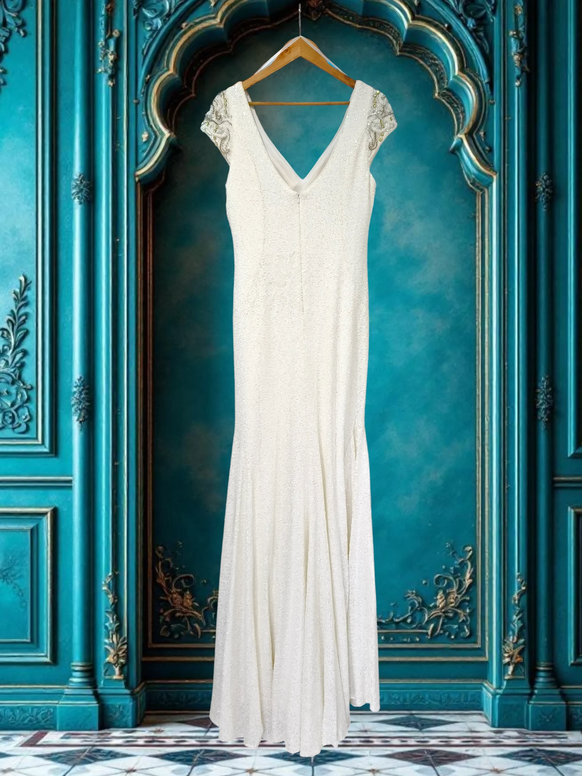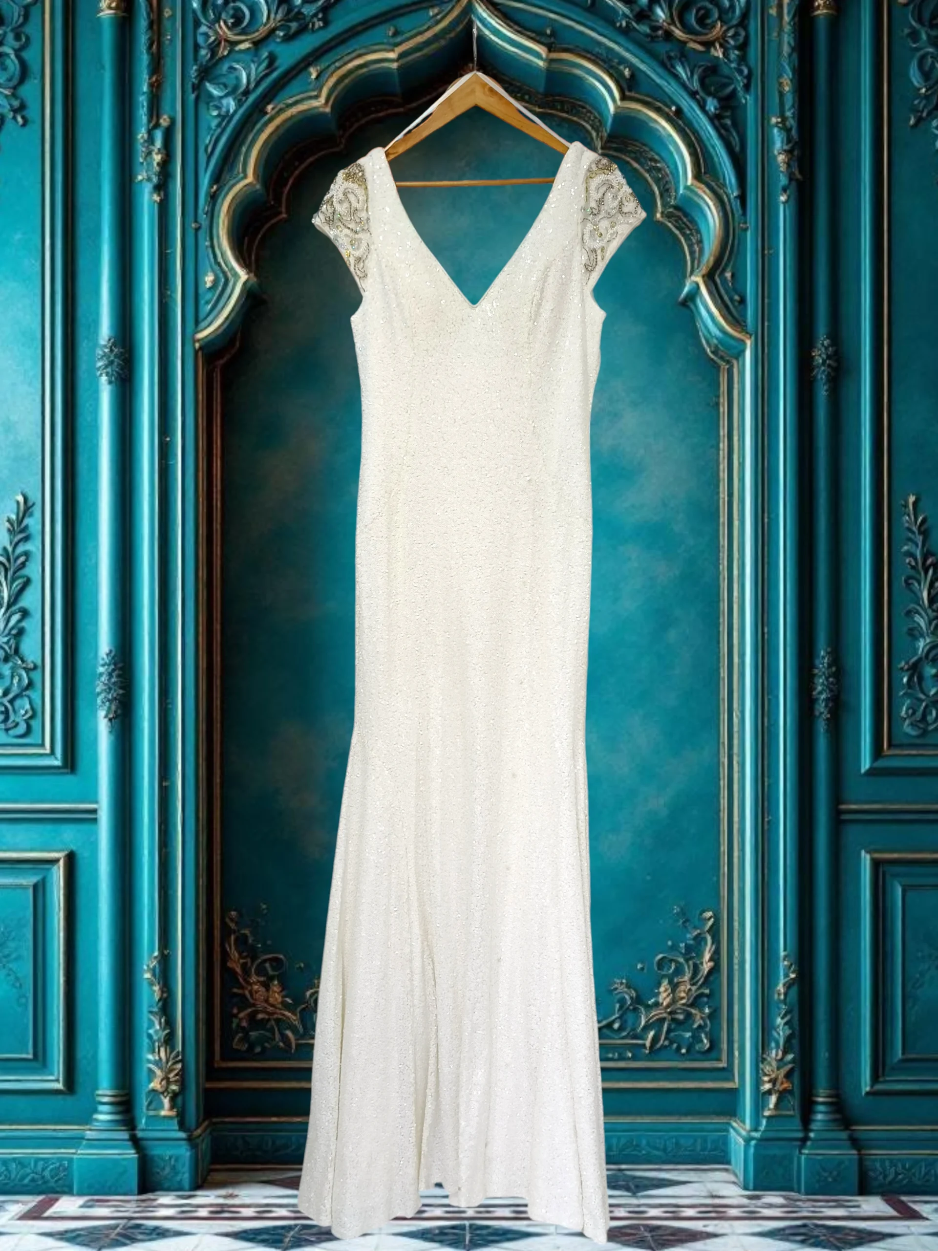 This elegant gown delivers old Hollywood glamour with its sleek, contoured trumpet silhouette and shimmering texture. Covered entirely in delicate micro-beading, the dress features a classic V-neckline framed by beautiful cap sleeves, which are heavily detailed with embellishments. The sophisticated, clean lines of the dress are maintained with a discreet vertical zip closure, making this an excellent choice for the bride who wants a dazzling yet refined wedding day look.