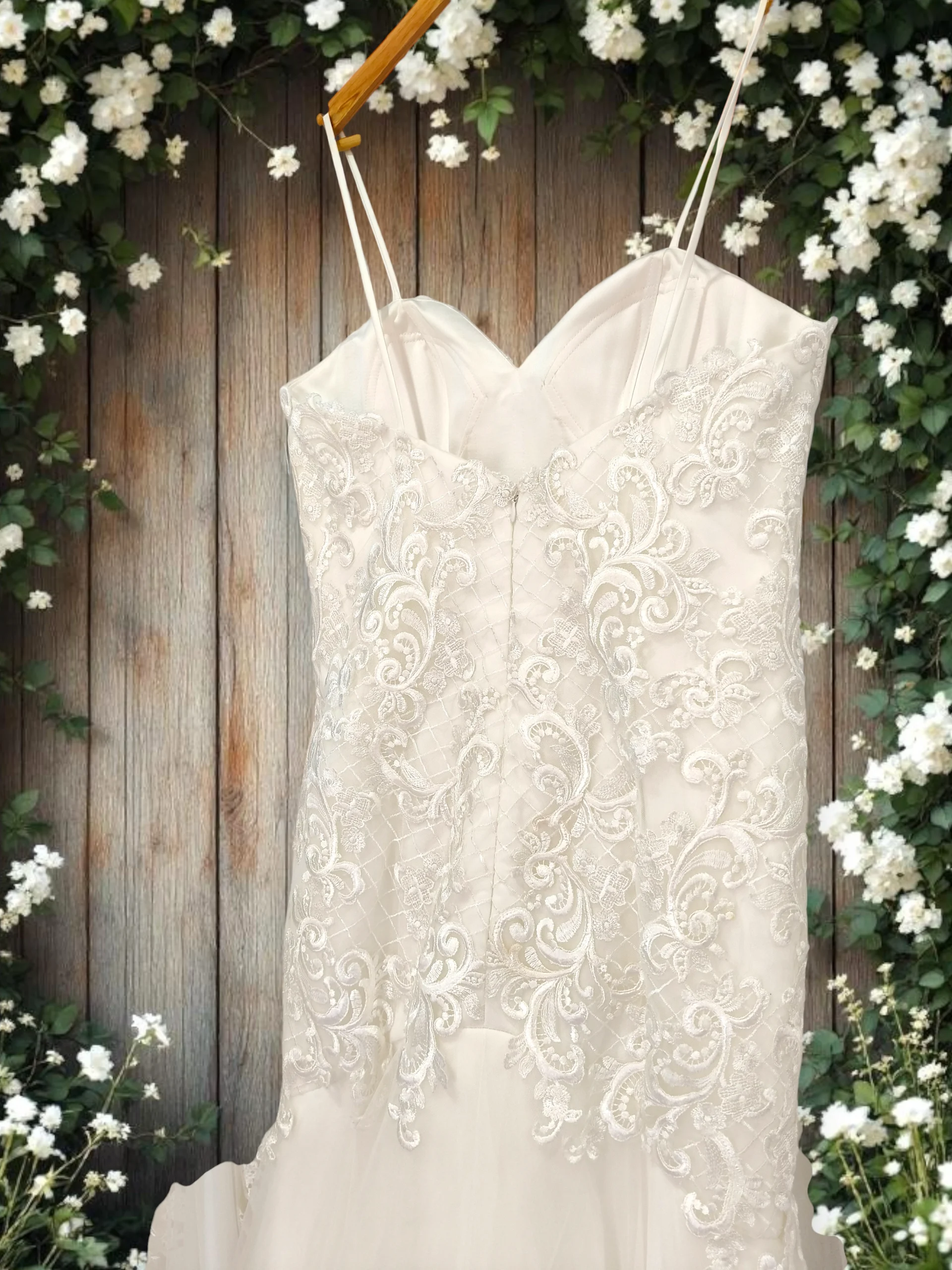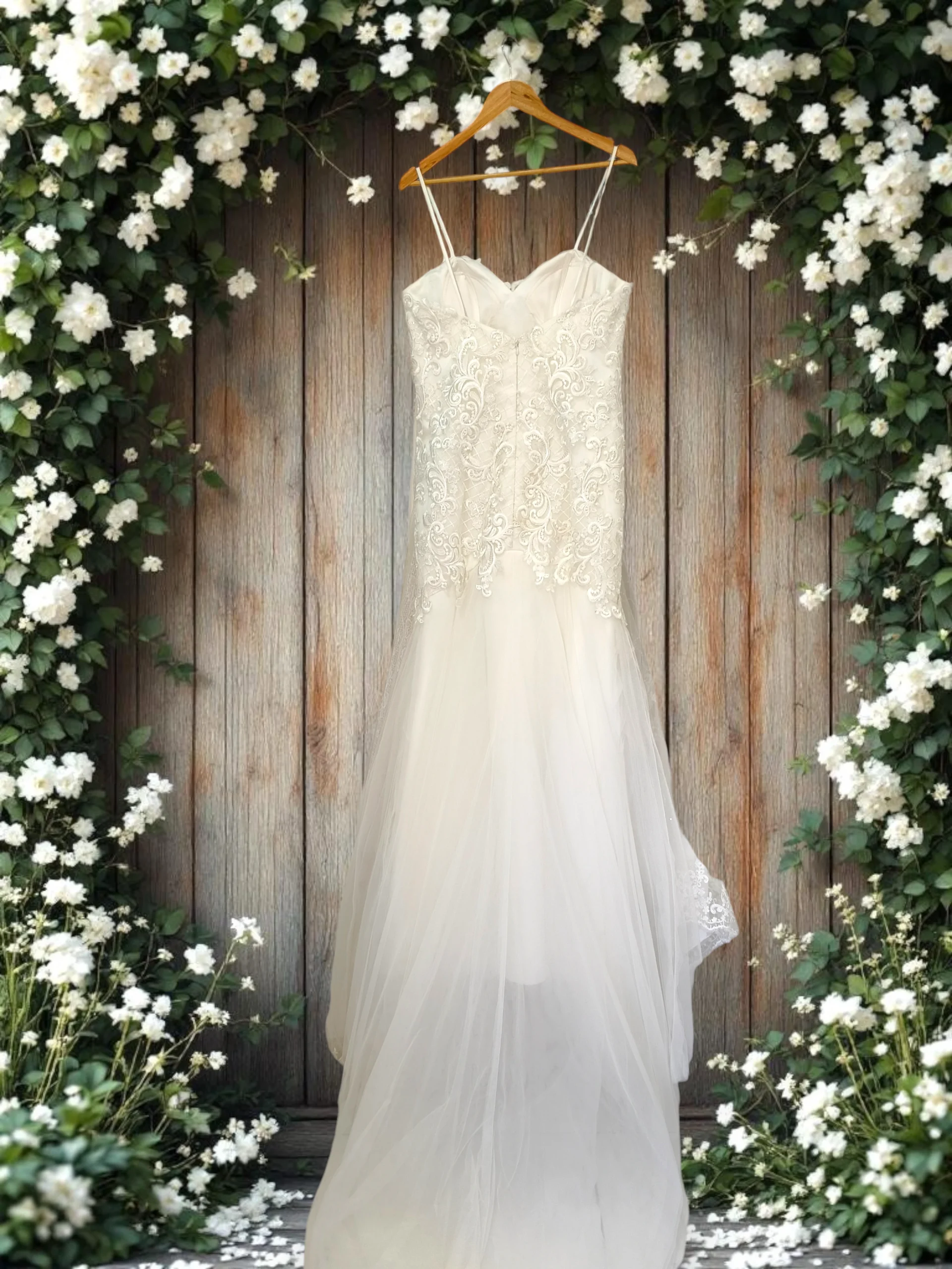 This enchanting gown features a captivating fit-and-flare silhouette, blending intricate detail with light, airy texture.The fitted bodice showcases a romantic sweetheart neckline with delicate spaghetti straps and is completely covered in beautiful lace that extends gracefully past the natural waist. Below the hip, the dress flares out into a voluminous skirt made of soft layers of tulle, creating an ethereal transition. The back is neatly finished with a vertical zip closure and a line of decorative buttons, making this a dreamy choice for a romantic or garden wedding.