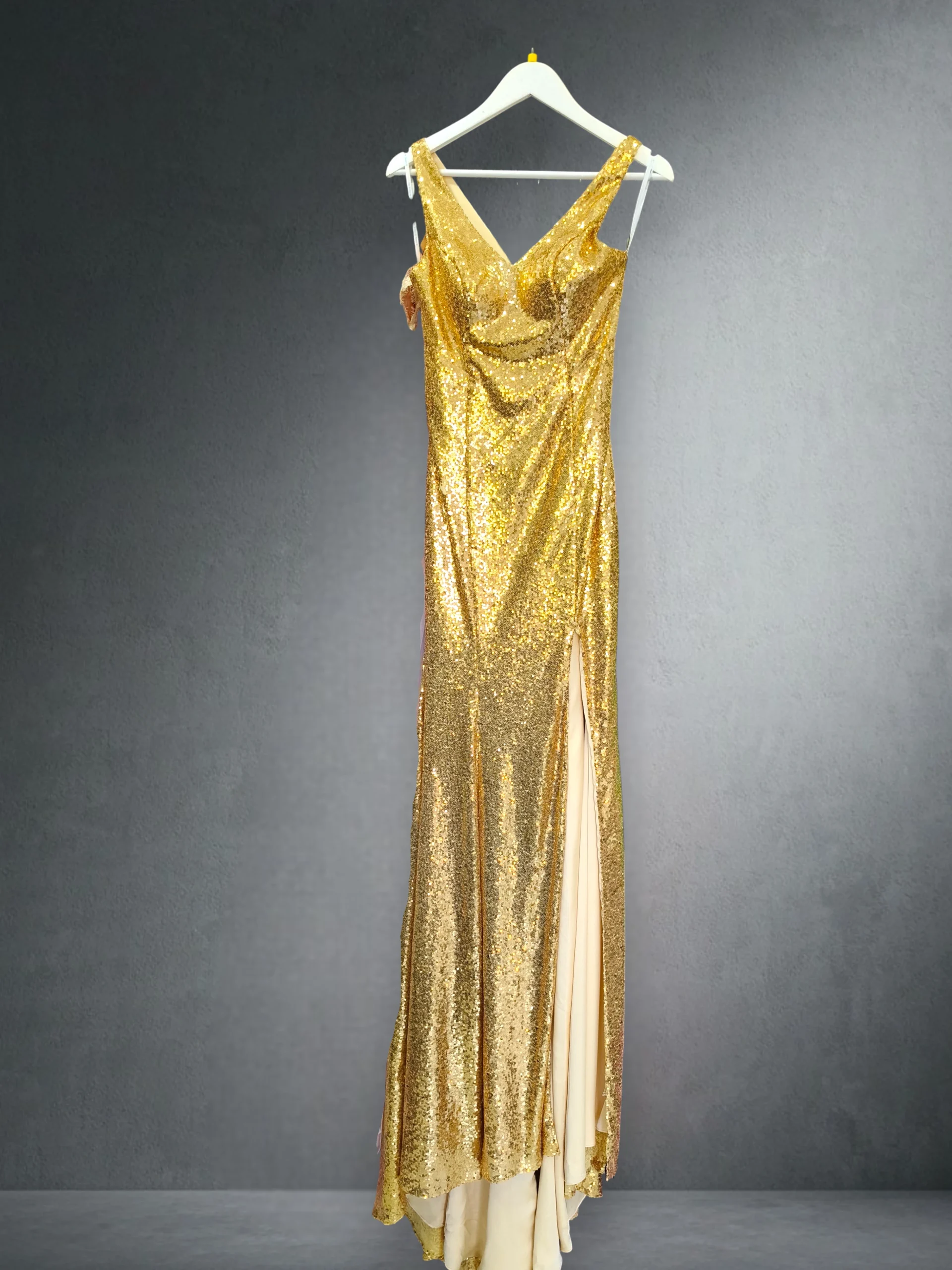 This glamorous gold sequin gown is designed to make a statement. The dress features a flattering v-neckline and is fully covered in shimmering gold sequins. It has a fitted silhouette that transitions into a slight mermaid at the hem. A high side slit adds a touch of allure while the back is a dramatic feature, with a deep open back and intricate criss-cross strap detail. This sophisticated maxi dress is perfect for galas, proms, black-tie events, or any occasion that calls for high-octane glamour.